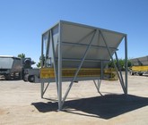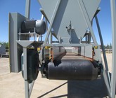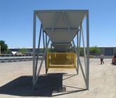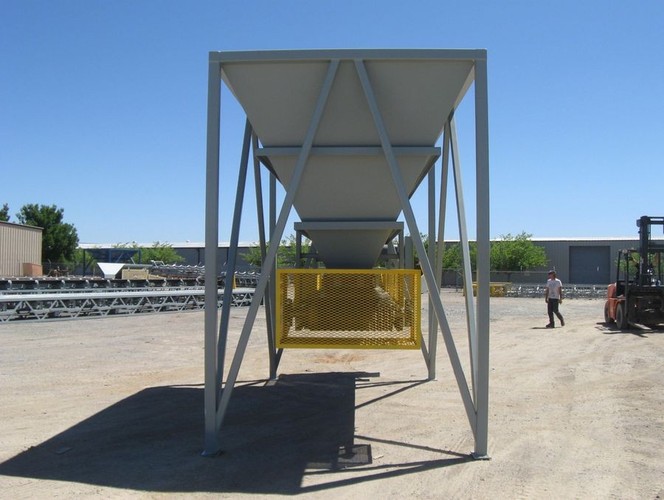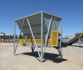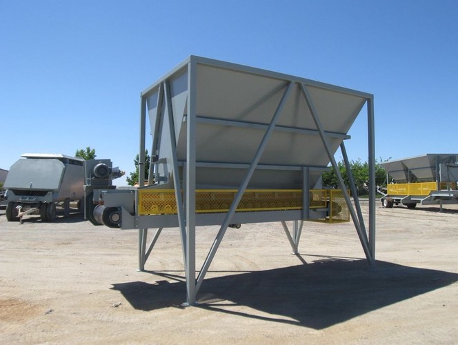 a. 7’-8" wide x 13’ long hopper opening with 13.5 cubic yards struck storage capacity; hopper constructed from 1/4” thick steel plate with square tube reinforcing at the hopper top and angle iron reinforcing at the hopper mid-section and bottom section; self-relieving tapered hopper bottom opening from 16" to 22" to minimize bridging; full length skirtboards with 3/4" x 6" adjustable rubber flashing to prevent leakage between hopper bottom and belt feeder; adjustable discharge gate with hand crank to control material flow from each hopper.
