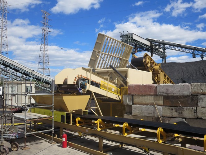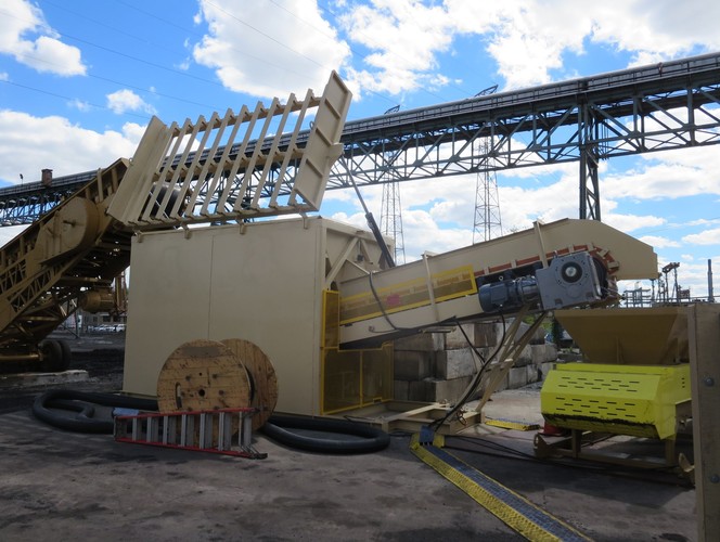 f. Electrical control station with main disconnect, custom electrical control panel with variable speed drive for the belt feeder 40 h.p. electric motor, custom electrical control panel for the hydraulic tipping grizzly with radio remote control, all mounted on a skid support structure.