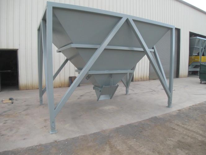 Rock Systems Gravity Flow Hopper model 103-8 with 12’-0” wide x 7’-6” deep hopper opening; 8 cubic yards storage capacity; hopper walls constructed of 1/4” thick steel plate with reinforcing; bolt on adjustable slide gate; steel fabricated support structure constructed of square tubing with cross bracing; adjustable height support legs with base plates adjust in 3” increments; one rust inhibitor prime coat and one finish coat gray enamel paint.
