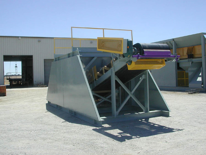 f) 42" wide heavy duty discharge conveyor with 25 h.p. electric motor, Dodge shaft mount speed reducer, v-belt drive and drive guard, Dodge rubber lagged head pulley, Dodge snub pulley outfit, Dodge self-cleaning tail pulley with screw take-up assemblies, skirtboards with adjustable rubber flashing at hopper, Flexco Rockline belt scraper, vulcanized endless 3 ply conveyor belting with 1/4" x 1/16" rubber covers, CEMA "C" 20 degree idlers with 5" rolls mounted on close centers at load point, CEMA "C" 20 degree idlers with 5" rolls mounted on 4' centers thereafter, CEMA "C" return idlers with 5" rolls and return idler guards.