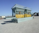a) Each hopper is 7’-8" wide x 13’ long hopper opening constructed from 1/4” thick steel plate with square tube reinforcing at the hopper top and angle iron reinforcing at the hopper mid-section and bottom section; self-relieving tapered hopper bottom opening from 16" to 24" to minimize bridging; full length skirtboards with 3/4" x 6" adjustable rubber flashing to prevent leakage between hopper bottom and belt feeder; adjustable discharge gate with hand crank to control material flow from each hopper.
