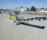 d) Collecting conveyor is 36” wide with fixed speed 10 h.p. electric motor, Dodge TXT315 shaft mount speed reducer, v-belt drive and OSHA drive guard; Dodge 14” diameter rubber lagged head pulley mounted on Dodge 2-3/16” SCM pillow block bearings; Dodge 12” diameter self-cleaning tail pulley mounted on Dodge 2-3/16” SCM pillow block bearings; screw take-up assemblies; OSHA tail terminal guard; head pulley nip guards; ICC CEMA “C” 35 degree troughing idlers with 5” diameter rolls; ICC CEMA “C” return idlers with 5” diameter rolls; 2 ply conveyor belting with 3/16” x 1/16” rubber covers; 22' long conveyor extension beyond the hoppers which folds for transport; conveyor belt hold down wheel.