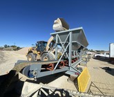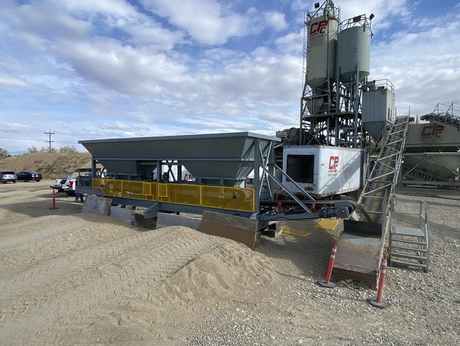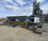 e) Portable trailer constructed of heavy duty wide flange beams which are braced for optimum rigidity; wide flange vertical beams and angle iron cross members tie all hoppers and trailer together; single axle chassis with dual 11 x 22.5 tires, air brakes, king pin, rear lighting, mud flaps and blocking pads. Includes one set of hand crank landing legs at the king pin.