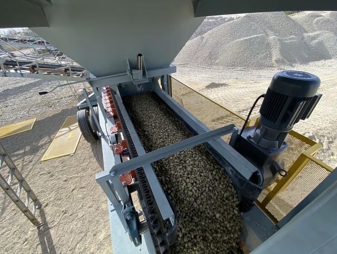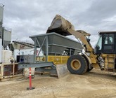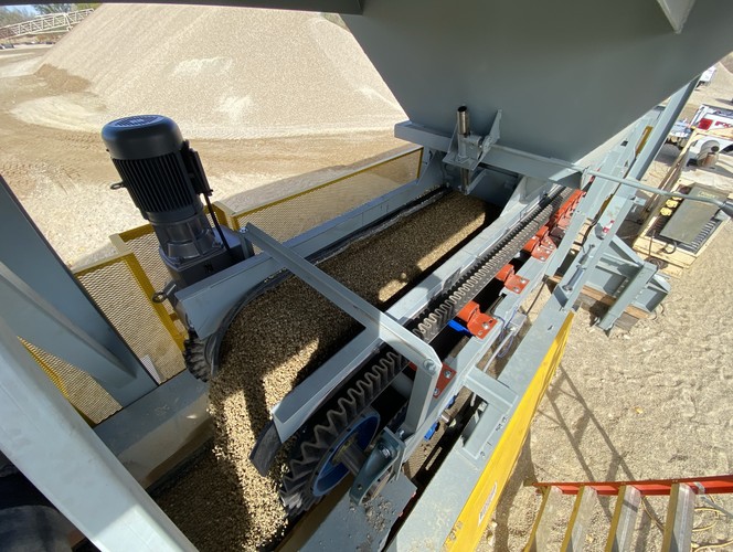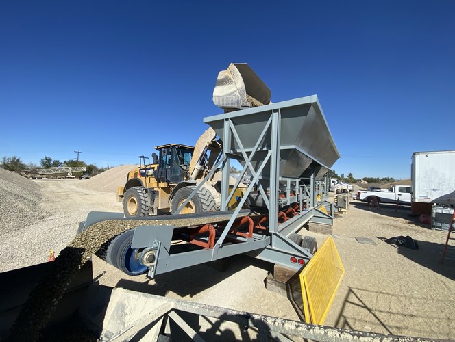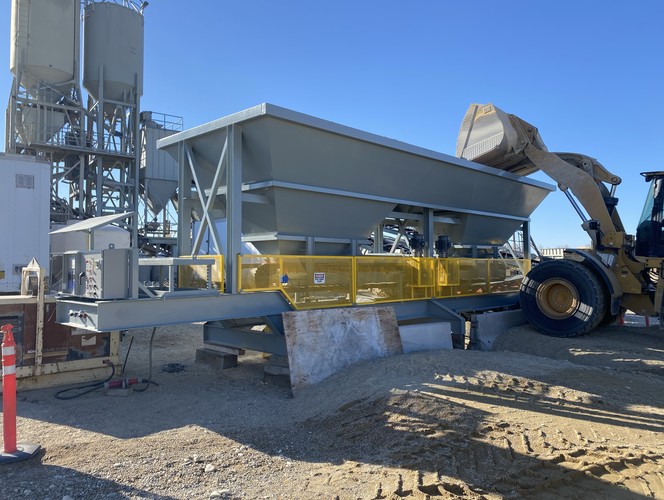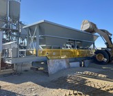 a) Each hopper is 9’-6” wide x 14’ long with 20 tons storage capacity constructed from 1/4” thick steel plate with rectangle tube reinforcing at the hopper top and angle iron reinforcing at the hopper mid-section and bottom section; self-relieving tapered hopper bottom opening to minimize bridging; adjustable discharge gate with hand crank to control material flow from each hopper.