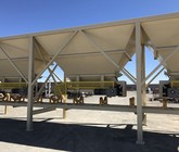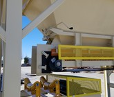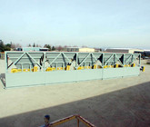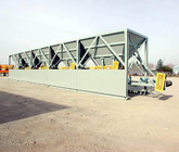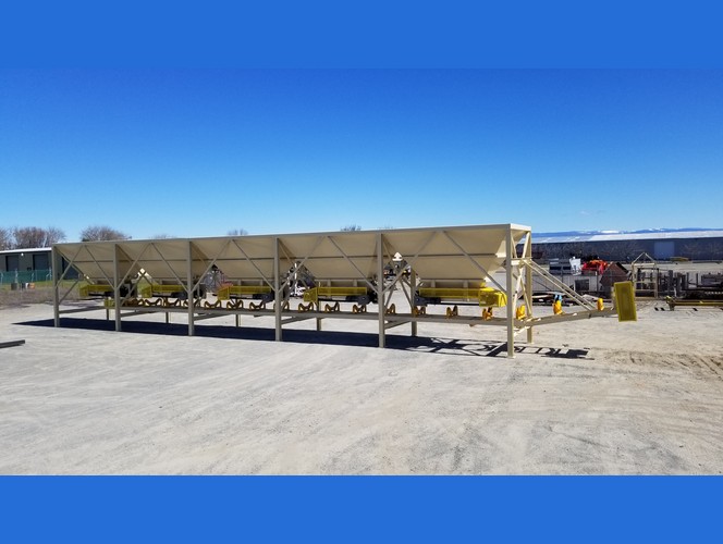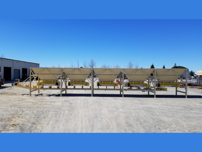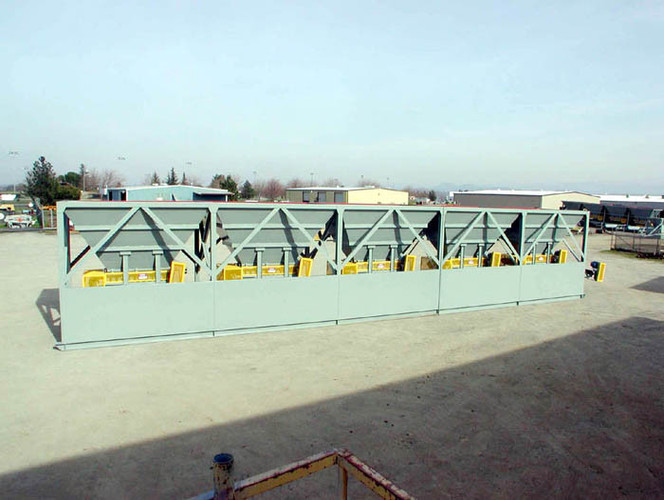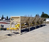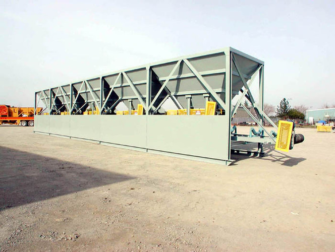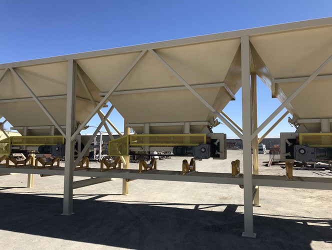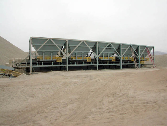 a. Each hopper is 9’-6” wide x 14’ long with 20 tons storage capacity constructed from 1/4” thick steel plate with rectangle tube reinforcing at the hopper top and angle iron reinforcing at the hopper mid-section and bottom section; self-relieving tapered hopper bottom opening to minimize bridging; full length skirtboards with Rema Skirt 50 adjustable rubber flashing to prevent leakage between hopper bottom and belt feeder; adjustable discharge gate with hand crank to control material flow from each hopper.