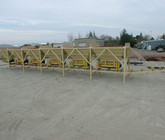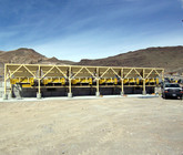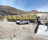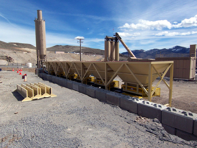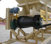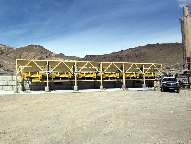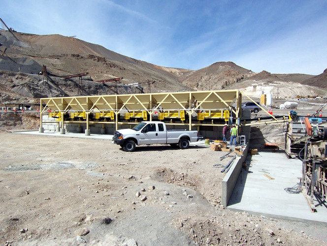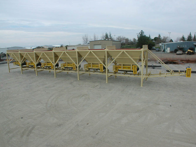 a. Each hopper is 9’-6” wide x 14’ long with 20 tons storage capacity constructed from 1/4” thick steel plate with rectangle tube reinforcing at the hopper top and angle iron reinforcing at the hopper mid-section and bottom section; self-relieving tapered hopper bottom opening to minimize bridging; full length skirtboards with Rema Skirt 50 adjustable rubber flashing to prevent leakage between hopper bottom and belt feeder; adjustable discharge gate with hand crank to control material flow from each hopper.