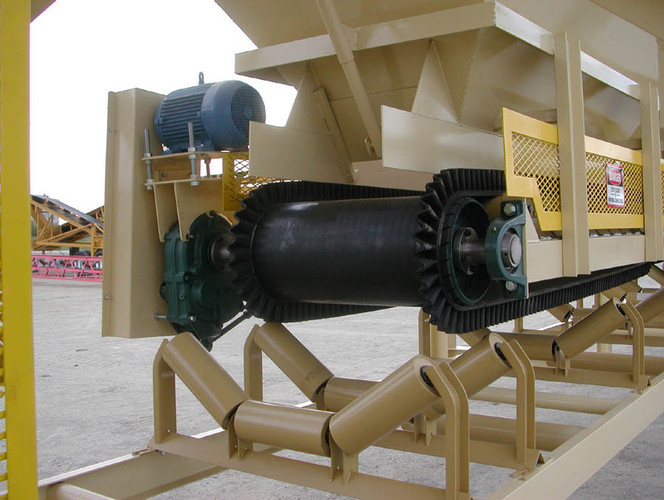 b. Each belt feeder is 30” wide x 8’ long with fixed speed 5 h.p. electric motor, Dodge TXT425 shaft mount speed reducer, v-belt drive and OSHA drive guard; Dodge 12” diameter rubber lagged head pulley mounted on Dodge 2-7/16” SCM pillow block bearings; Dodge 12” diameter self-cleaning tail pulley mounted on Dodge 1-15/16” SCM pillow block bearings; screw take-up assemblies; OSHA tail terminal guard and side nip guards; ICC CEMA “C” flat belt idlers with 5” diameter rolls mounted on close centers; 3 ply vulcanized endless conveyor belting. Belt speed setup for 90 fpm.