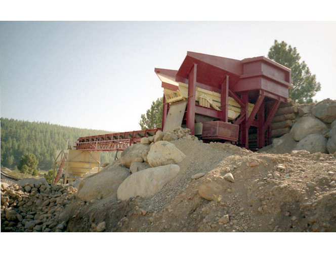 a) 52" wide x 20' long vibrating grizzly feeder complete with 14' solid pan impact section and 6' long adjustable grizzly bar section; bolted vibrator assembly with timed eccentric shafts; self-aligning spherical roller bearings; oil bath lubrication; bolt-on abrasion resistant liners; 40 h.p. electric motor; pivoted motor base; drive and driven sheaves; v-belts; OSHA drive guard; heavy duty spring supports and springs.