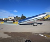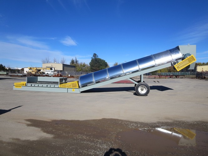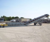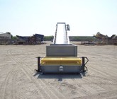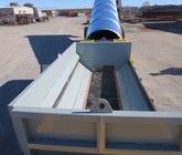 b) 48” wide discharge conveyor complete with 25 h.p. electric motor, Dodge TXT625 shaft mount reducer with internal backstop; v-belt drive and drive guard; 20” rubber lagged head pulley; 8” snub pulley; 12” self-cleaning tail pulley with screw take-up assemblies; Dodge pillow block bearings; 3 ply conveyor belting with 3/16” x 1/16” rubber covers; CEMA “C” flat belt idlers mounted on close centers at load point followed by CEMA “C” 20 degree troughing idlers mounted on 4’ centers; CEMA “C” return idlers mounted on 10’ centers with return idler guards; vertical curve with hold down wheels; Flexco Rockline belt scraper; steel fabricated discharge hood with AR liners. 250 feet per minute belt speed.