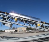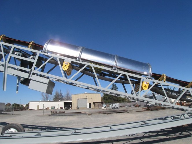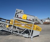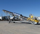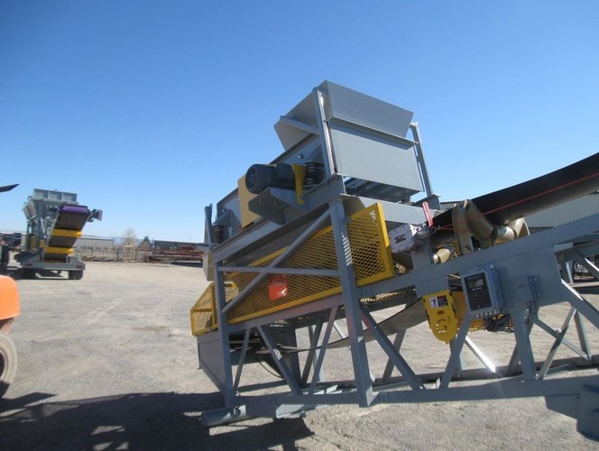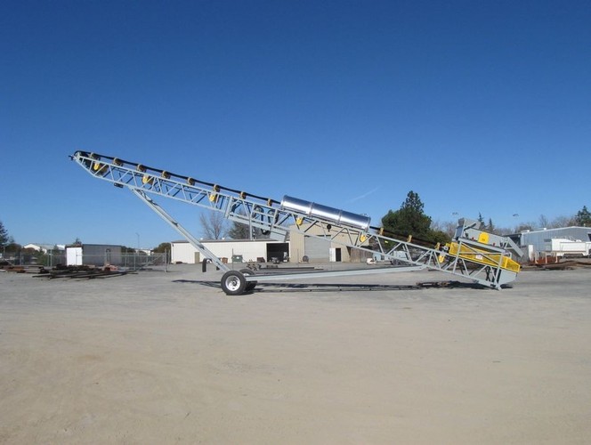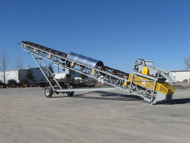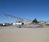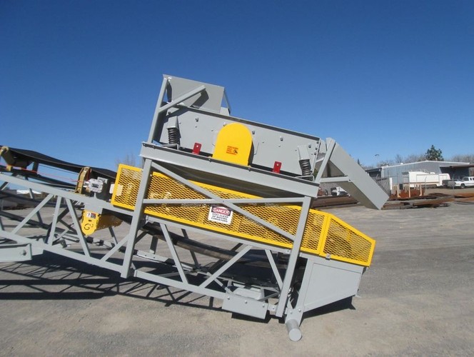 Rock Systems 24" wide x 65' long portable weigh conveyor with 10 h.p. electric motor, Dodge shaft mount speed reducer with internal backstop, v-belt drive and drive guard, rubber lagged head pulley, self-cleaning tail pulley, pillow block bearings, gravity take-up assembly with weight box, CEMA “C” troughing and return idlers, 30” deep truss conveyor frame construction, 2 ply conveyor belting, portable undercarriage with adjustable height, pneumatic tires, lights, flaps and air brakes, 5th wheel pin, Belt-Way belt scale installed under galvanized hood covers, 3’ wide x 6’ long single deck vibrating screen with 5 h.p. electric motor drive, oversize discharge chute, colecting hopper with skirtboards and rubber flashing.